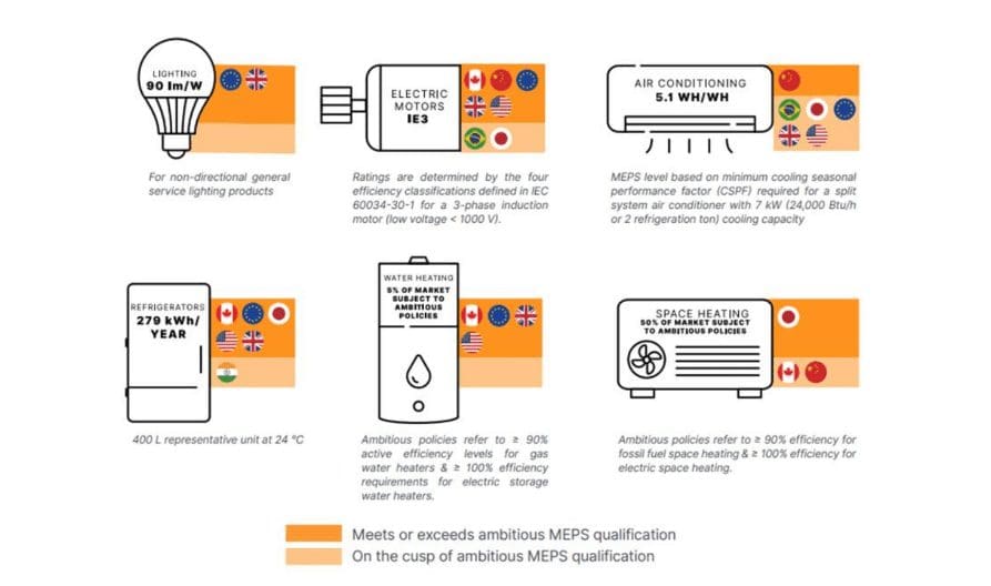 CLASP – the Collaborative Labeling and Appliance Standards Program – found that “some large economies have ambitious MEPS, with many others right on the cusp… [but] the global community is still off-track to deliver the promises of the Paris Agreement”.