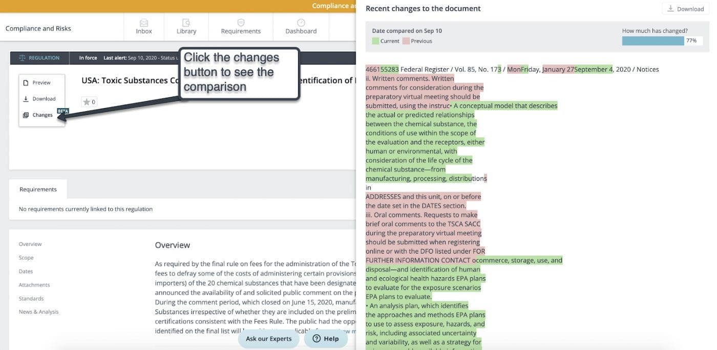 The new comparison functionality in C2P allows users to see the changes in a new version of a regulatory text. For any regulation where the text has been updated by the regulator, users will now be able to: