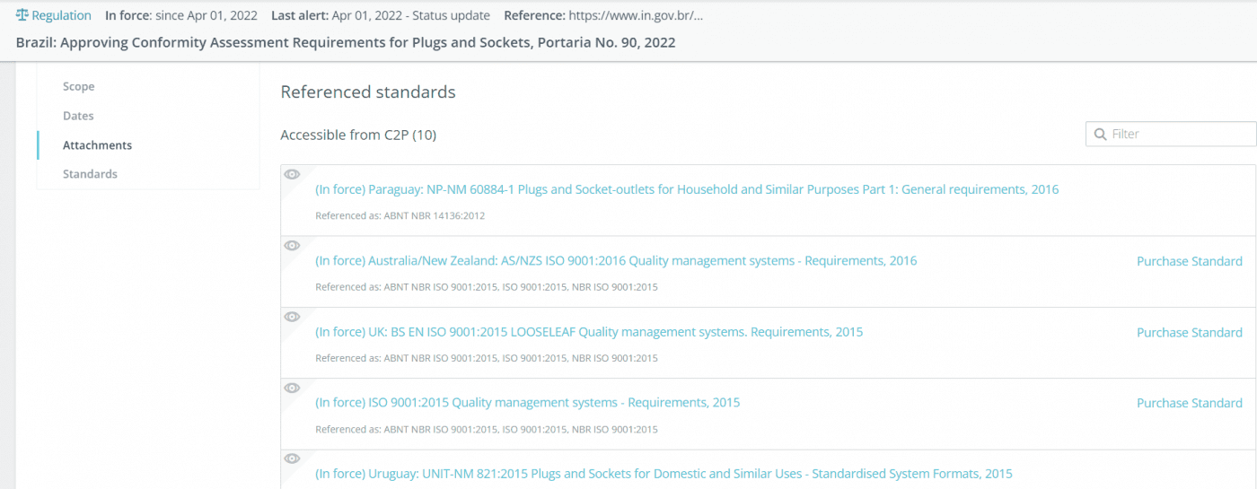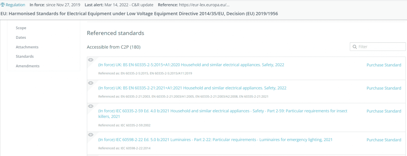 With C2P, our enterprise ready, market access solution, you have access to the most relevant Regulations for your products, integrated with the Standards that reference them. We alert you of new and changing Regulations & Standards allowing you to assess their relevance and manage the impact throughout your organization.