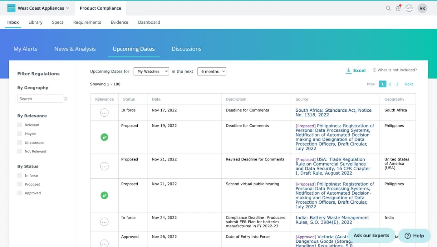 See Figure 1 below, a screenshot from C2P Product Compliance Solution, showcasing the timeline of upcoming regulatory changes.