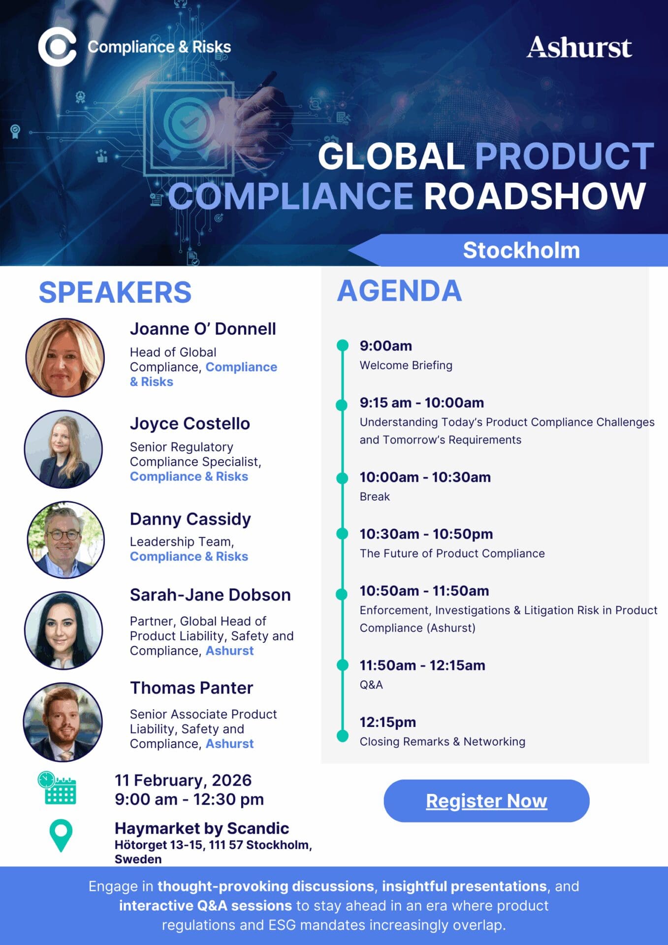 Prepare to be informed, equipped, and ready to navigate the future of product compliance—while understanding how sustainability requirements increasingly intersect with regulatory obligations.