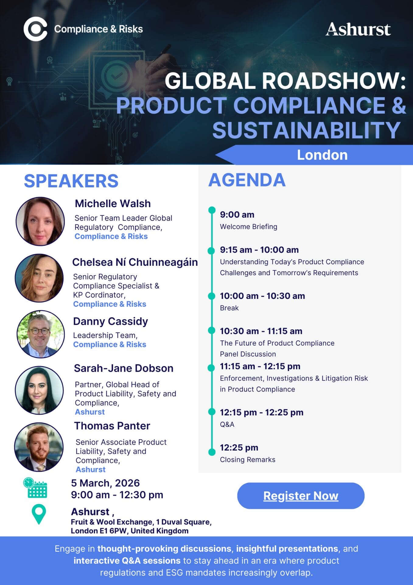 Prepare to be informed, equipped, and ready to navigate the future of product compliance—while understanding how sustainability requirements increasingly intersect with regulatory obligations.
