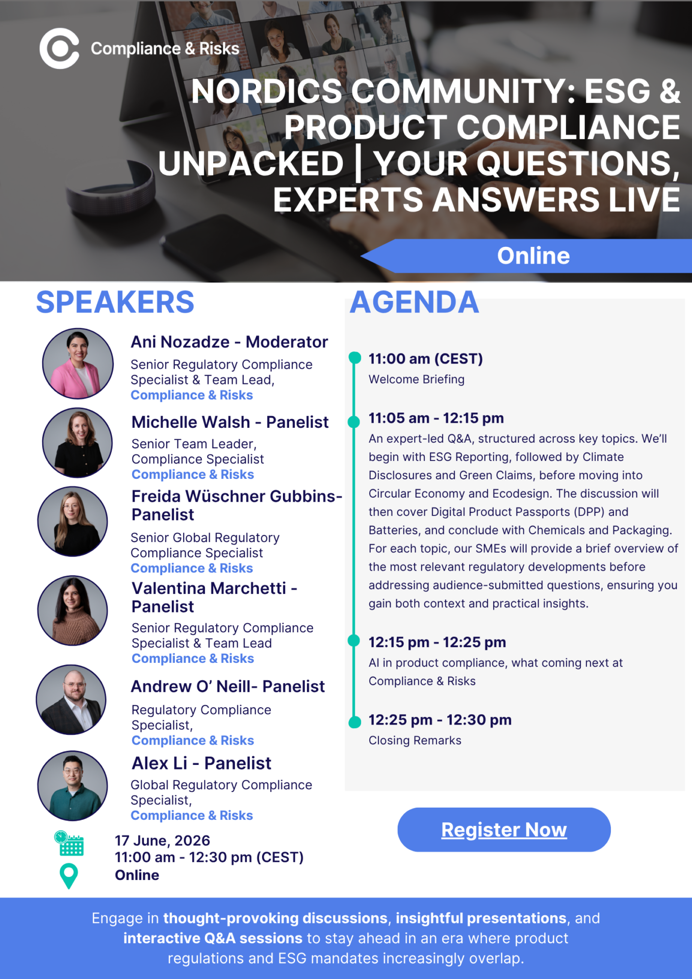 Join Compliance & Risks for a fresh, interactive virtual event where your questions shape the conversation. Instead of sitting through presentations, you’ll submit your most pressing ESG and product compliance questions in advance—and our panel of subject matter experts will answer them live, offering clear, practical insights you can act on immediately.