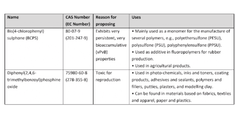The two substances are Bis(4-chlorophenyl) sulphone (BCPS) and Diphenyl(2,4,6-trimethyl benzoyl)phosphine oxide. They have been proposed as Candidate List additions by Austria and Sweden respectively. Supporting detail is found in the table